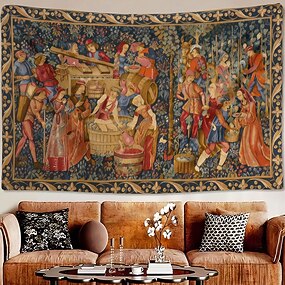 tapeçaria medieval com colheita de uvas, prensagem de uvas, vida na aldeia renascentista, pessoas colhendo vinho em barris, borda floral, decoração de parede para cozinha, sala de jantar e casa,