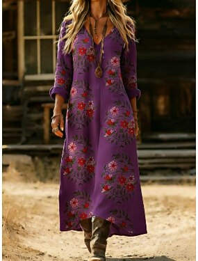 Mulheres Vestido maxi longo Vestido Boho Vestido antigo Vestido casual Vintage Diário Ao ar livre Férias Normal Floral Manga Longa Decote V Roxo Primavera Outono