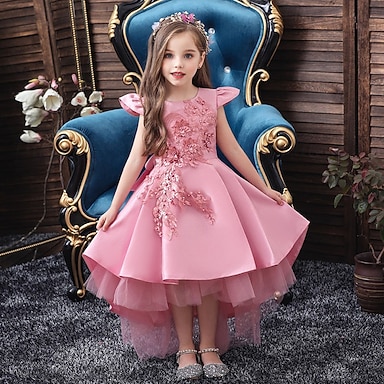 Vestido de daminha, vestido de primeira comunhão, vestido formal para meninas, traje de casamento, festa, moda formal, adorável princesa, patchwork, tule, cor sólida, manga curta, gola redonda, rosa