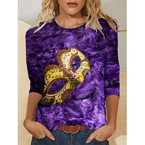 Camiseta Feminina de Carnaval Gráfica Vintage Fashion Estilosa de Manga Longa Gola Careca Regular Tops Diários de Final de Semana Impressão Roxa Verão Primavera Outono