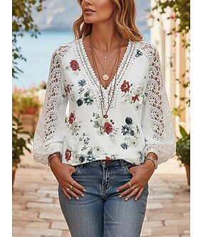 Mulheres Camiseta Renda Patchwork Imprimir Floral Moda Moderno Casual Manga Longa Decote V Tops regulares Diário Final de semana Branco Verão Primavera Outono