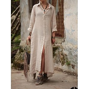 Mulheres Vestido maxi longo Linho de algodão sintético Camisetão Vestido Kaftan Vestido casual Básico Moderno Diário Final de semana Ajuste Largo Tecido Manga Longa Pescoço Dividido Preto Vinho Caqui