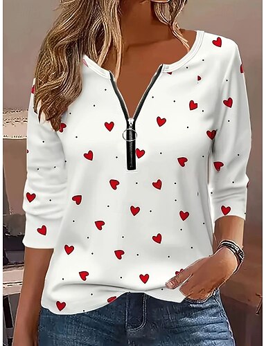 Dia dos Namorados Mulheres Camiseta Zíper Imprimir Coração Gráfico Boêmia Tropical Havaiana Manga Longa Decote V Tops regulares Diário Para Noite Final de semana Azul Vermelho Verão Primavera Outono