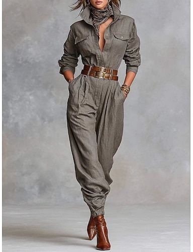 Mulheres Normal Macacão Elegante Côr Sólida Manga Longa Colarinho de Camisa Bolsos Botões Diário Casa Normal Cinzento Primavera