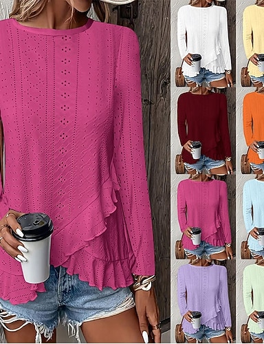 Páscoa Mulheres Camisa Pointelle Topo de ilhó Blusa Frufru Ilhó Côr Sólida à moda Básico Casual Manga Longa Gola Redonda Tops regulares Casual Diário Praia Azul Branco Amarelo Vinho Fúcsia Primavera