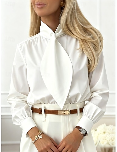 Mulheres Blusa Cordões Côr Sólida Elegante à moda Básico Manga Longa Gravata no pescoço Tops regulares Diário Streetwear Trabalho Preto Branco Primavera Outono