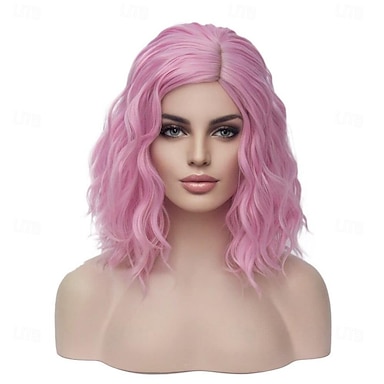 Peruca Ombre Rosa Curta Ondulada em Camadas com Franja Peruca Sintética para Meninas Uso Diário Peruca Colorida para Festas Halloween