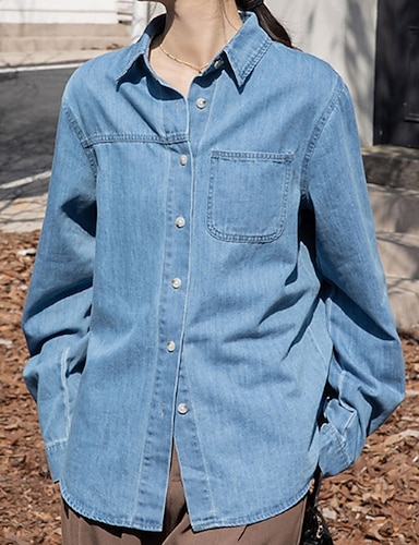 Mulheres Camisa Social Blusa Tecido Casual Manga Longa Colarinho de Camisa Tops regulares Diário Feriado Bolsos Botões Azul Outono Inverno