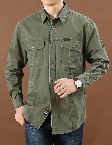 Homens camisa cargo Camisa de Trilha Manga Longa Aberto para a Lateral Blusas Ao ar livre Respirável Primavera Outono Algodão Preto Verde Tropa Cáqui Caça Exercite-se Viajar