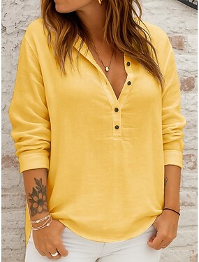 Mulheres Camisa Social Mistura de Algodão Blusa Botões Tecido Moderno Casual Manga Longa Decote V Tops regulares Diário Para Noite Amarelo Rosa Cáqui Cinzento Verão