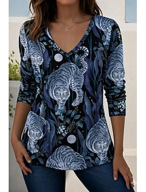 Mulheres Camiseta Imprimir Gráfico Animal Gato Elegante Vintage Moda Manga Longa Decote V Tops regulares Diário Final de semana Azul Rosa Roxo Primavera Outono
