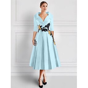 Vestidos de coquetel A-Line Bordados Vestido Smoking Mãe da Noiva Elegante Formal Comprimento do Tornozelo Manga 3/4 Gola de Camisa Bolso Cetim com Apliques