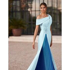 Sereia Longo Vestidos de baile Vestidos de noite Vestido de Baile Vestido formal Elegante Bloco de Cor Manga Curta Assimétrico Formal Casamento Vestido champanhe para mãe da noiva Cetim com Fenda