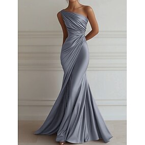Vestido de Festa Sereia  Trompete Elegante Formal para Casamento Comprido Sem Mangas Um Ombro Vestido em Cetim Stretch com Pregas