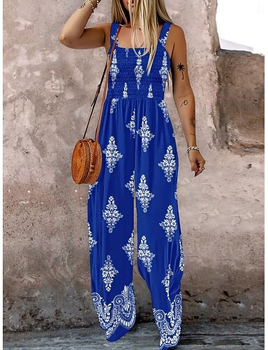 Mulheres Normal Macacão Ativo Floral Sem Manga Perna larga Decote Quadrado Bolsos Imprimir Diário Férias Ajuste Largo Azul Preto Fúcsia Verão