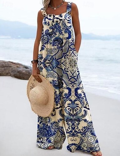 Womens Dungarees 100% Algodão Ativo Gráfico Sem Mangas Reto Decote Quadrado Com Bolso Férias Diário Ajuste Solto Branco Azul Verde Verão