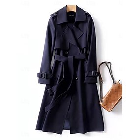 Mulheres Casaco impermeável Confortável Respirável Botões Com cinto Casual Tecido Férias Rua Casual Roupa Diária Não Trespassado Longo Aberto para a Lateral Normal Manga Longa agasalhos Azul marinho