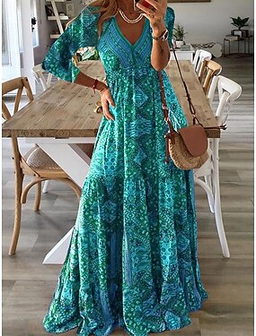 Mulheres Vestido Longo Vestido Boho Vestido casual Vestido Swing Elegante Moda Moderno Ao ar livre Férias Para Noite Normal Tribal Manga Longa Decote V Azul Verão Primavera