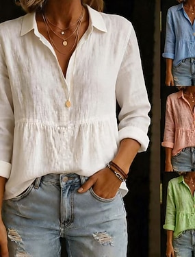 Camisa de Linho Falso como Algodão para Mulheres Camisa de Verão Camisa Casual Camisa de Praia Botões Plain Estilosa Básica Casual Manga Longa Gola Tops Regulares para o Dia a Dia Roupas de Férias