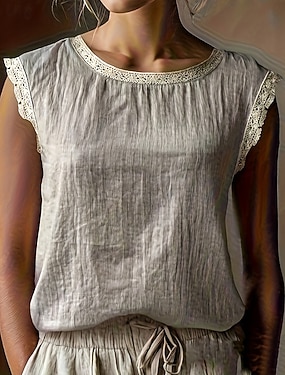 Mulheres Blusa Tops de renda Linho de algodão sintético Renda Tecido Casual Sem Manga Gola Redonda Tops regulares Diário Feriado Para Noite Cáqui Verão Primavera