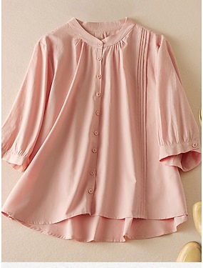 Mulheres Linho de algodão sintético Franzido Côr Sólida Vintage Básico Casual Manga 3/4 Gola Alta Tops regulares Diário Azul Branco Rosa Bege Cinzento Verão Primavera Outono