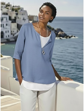 Mulheres Camisa Social Botão para cima Linho de algodão sintético Manga 3/4 Gola Redonda Branco Verão Primavera Outono