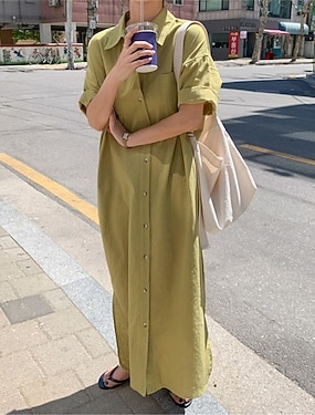 Mulheres Vestido Longo Vestido Maxi Linho de algodão sintético Camisetão Vestido Kaftan Vestido casual à moda Casual Diário Férias Encontro Normal Tecido Manga Curta Lapela Amarelo Rosa Verde Damasco