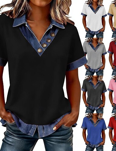 Tops Waffle Femininos Malha Texturizada Camiseta Cor Block Gráfica Tribal Estilosa Clássica Manga Curta Henley Tamanhos Regulares Diários Esportivos Azul Verde Azul Preto Verão Primavera
