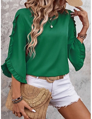 Mulheres Camisa Social Blusa Blusa com babados Frufru Tecido à moda Clássico Moderno Manga 3/4 Gola Redonda Tops regulares Diário Feriado Para Noite Preto Vermelho Laranja Verde Damasco Verão