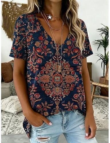 Mulheres Camiseta Imprimir Gráfico Estampado Cashemere Vintage à moda Clássico Manga Curta Decote V Tops regulares Diário Azul Rosa Roxo Verde Verão Primavera