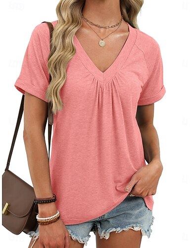 Mulheres Blusa Côr Sólida à moda Casual Manga Curta Decote V Tops regulares Diário Branco Rosa Roxo Cinzento Verão