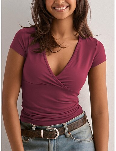 Mulheres Blusa Côr Sólida à moda Casual Manga Curta Decote V Tops regulares Diário Branco Rosa Roxo Cinzento Verão