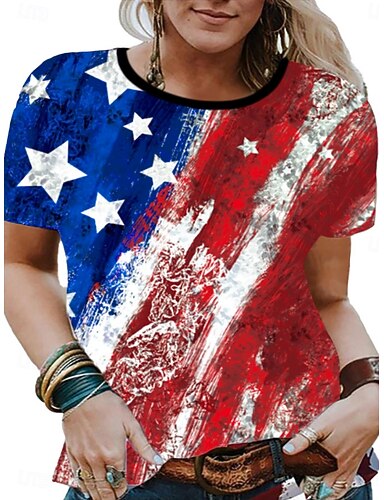 Dia da Independência Americana Mulheres Camiseta T-shirt Imprimir Floral Gráfico à moda Clássico Casual Manga Curta Gola Redonda Tops regulares Diário Para Noite Final de semana Azul Preto Branco