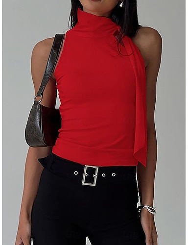Mulheres Camiseta Malha Íntima T-shirt Franzido Patchwork Côr Sólida Moda Clássico Casual Sem Manga Gola Alta Tops curtos Diário Para Noite Final de semana Preto Rosa Vermelho Bege Verão Primavera