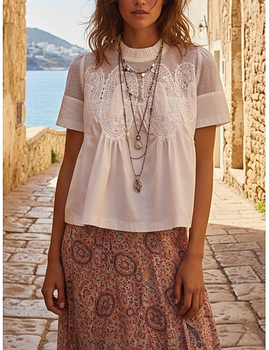 Mulheres camisa de verão Camisa casual Blusa Renda Patchwork Botões Côr Sólida Elegante à moda Casual Manga Curta Aberto para a Lateral Tops regulares Diário Ao ar livre Feriado Branco Verão Primavera