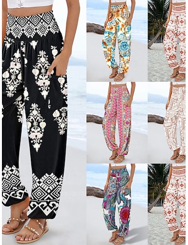 Mulheres Linho de algodão sintético Perna larga Calça verão Calças Estilo Étnico Casual Boho Comprimento total Cintura Alta Gradiente Bolsos Cintura elástica Estampado Respirabilidade Macio