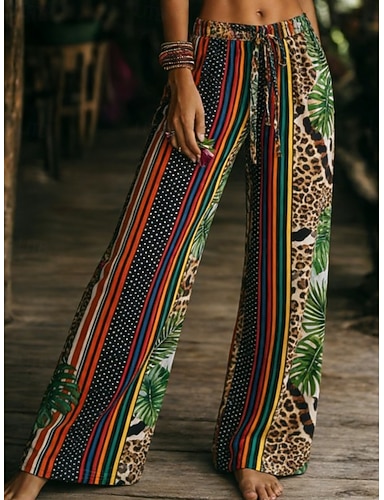 Mulheres Perna larga Calças Férias Moda Boho Comprimento total Cintura Média Gráfico Leopardo Listrado Bolsos Cintura elástica Imprimir Confortável Respirabilidade Sem Elasticidade Diário Ao ar livre