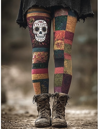 Leggings Femininas Férias Vintage Moda Comprimento Total Cintura Alta Gráfico Caveira Impressão Abstrata Macia Respirável Elástica Formal Ao Ar Livre Férias Azul Roxo Verde Cinza Primavera Outono