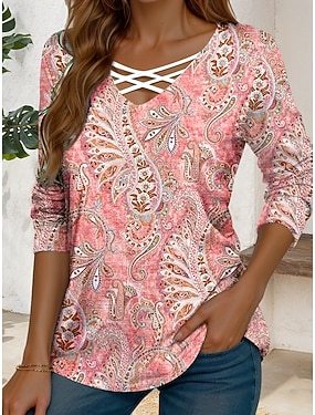 Mulheres Camiseta Com Corte Imprimir Gráfico Estampado Cashemere Vintage à moda Clássico Manga Longa Decote V Tops longos Diário Azul Amarelo Rosa Verde Verão Primavera