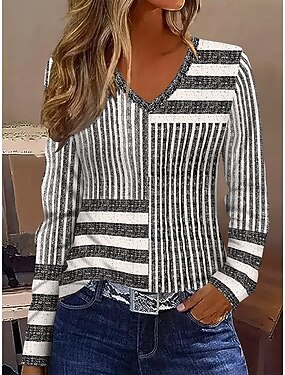 Blusa Feminina T Shirt V Neck Manga Longa Tunic Listrada Moda Manga 3/4 Regular Tops Impressão Diária Preta Primavera Outono