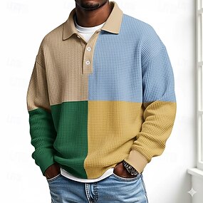 Homens Geométrica Bloco de cor Camisas Polo Waffle Textura Manga Longa Camisas polo Lapela Roupa de Esporte Casual Escola Roupa Esportiva Roupa Diária Impressão 3D Outono & inverno Azul Marron Verde