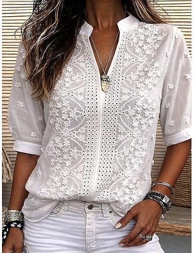 Mulheres Blusa Renda Ilhó Côr Sólida à moda Casual Meia Manga Decote V Tops regulares Diário Branco Verão Primavera