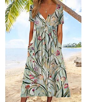 Mulheres Vestido Longo Vestidos Para o Verão Vestido T shirt Vestido A Line Férias Casual Praia Para Noite Padrão Floral Gráfico Manga Curta Decote V Azul Rosa Cinzento Verão Primavera