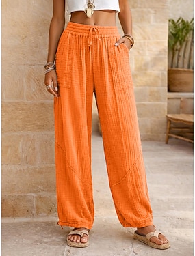 Mulheres Linho de algodão sintético Perna larga chinês Calça verão Férias Roupa de rua Casual Comprimento total Cintura Média Tecido Com Cordão Bolsos Respirável Micro-Elástica Diário Ao ar livre Rua
