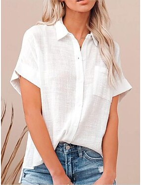 Mulheres Camisa Social Botão para cima Blusa Linho de algodão sintético Bolsos Botões Côr Sólida Básico Casual Manga Curta Colarinho de Camisa Tops regulares Diário Branco Azul Céu Verão