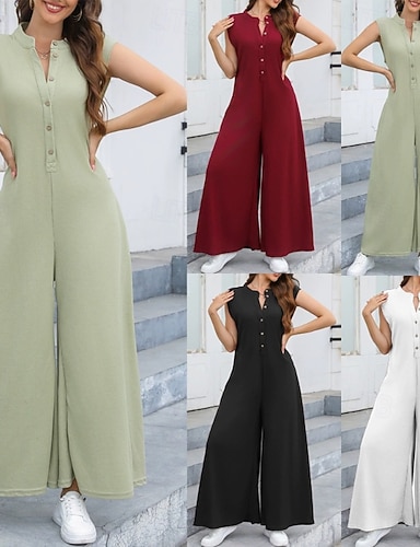 Mulheres Normal Macacão Ativo Côr Sólida Sem Manga Perna larga Decote Redondo Botões Diário Praia Ajuste Largo Preto Branco Verde Verão