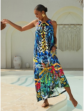 Mulheres Feminino Vestido casual Azul Sem Manga Geométrica Verão Estações Cruzadas Decote Redondo Férias Moderna S M L