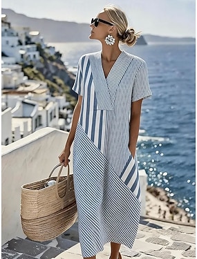 Mulheres Vestido midi Linho de algodão sintético Vestido de turno Vestido Maxi Algodão Casual Ajuste Largo Listra Manga Curta Colarinho de Camisa Lapela Azul Amarelo Claro Preto Branco Verão