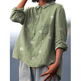 Mulheres Camisa Social Linho de algodão sintético Manga Longa Colarinho de Camisa Azul Branco Verde Primavera & Outono