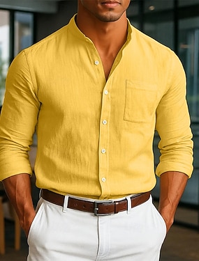Homens Camisa Social Camisa de linho camisa de botão Tecido Férias Casual Preto Branco Amarelo Azul Marinha Manga Longa Faixa Verão Outono Roupa Bolsos